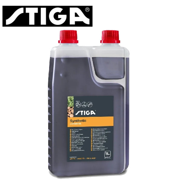 STIGA 2-tahtiöljy moottorisahoille ja raivaussahoille 1 litran annostelijalla varustetussa pullossa.