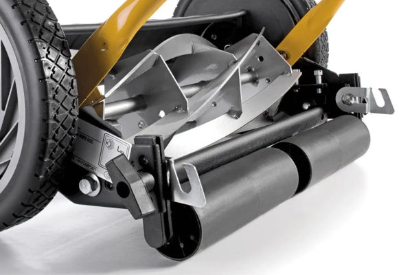 Työnnettävä kelaleikkuri 40 cm leikkuuleveydellä ja taakse ohjautuvalla ruohonpoistolla.